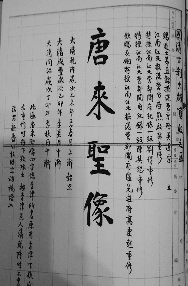 这方匾额原来应该是明代所立,为何这么说呢?《掘港史料·艺文》中载唐来圣像第一上款是“赐进士第直隶掘港营守府吴道宗立”,明代实行两京制,匾额上的直隶就是指南直隶,即今天的江苏、安徽、上海,掘港营属于南直隶的范围,到清代康熙年间分南直隶江南省为江苏和安徽两省。国清寺所处的位置是掘港东营,掘港营守备吴道宗敬立了此匾额,吴道宗虽为守备,但明代文人带兵的颇多,吴守备还是赐进士,这块匾额有可能是这位守备大人所书。因无这位吴守备的记载,笔者推测在明嘉靖以后,即明中晚期到清康熙年间,庙宇可能又进行了一次修整,同时大雄宝殿的匾额也重修了。这次重修是由当时掘港营守备熊启昌主持。熊守备是康熙四十年(1701)前后在掘港营任职的,这次重修应该就在这个时间段。以上是笔者根据文字记载,依据志书上守备任职时段作的推测。又过了60多年,住持雨山对国清寺进行大修,估计“唐来圣像”匾额已经破损严重,守备刘德请当时本邑书法家李津重书匾额,匾额依然保留了“吴道宗”“熊启昌”的上款,但两个下款破损看不真切就没有保留。到咸丰五年(1855),掘港营都司陈其恕重修大雄宝殿“唐来圣像”匾额,同治六年(1867),掘港营都司高连超又重修“唐来圣像”匾额,这是该匾额第四、第五次重修。可能是最后一次重修的时候去除了书匾人李津的下款,为何要去除呢?笔者推测是上下款过多,匾额上容纳不下了。这样匾额的面貌最终固定了下来,一直到新中国成立以后。1968年国清寺拆除,所有的匾额、楹联被县文化馆收集保管,后来这些匾额、楹联在那个特殊的年代多散失了,据说“唐来圣像”匾额被用来生火点了煤球炉,实在是可惜。