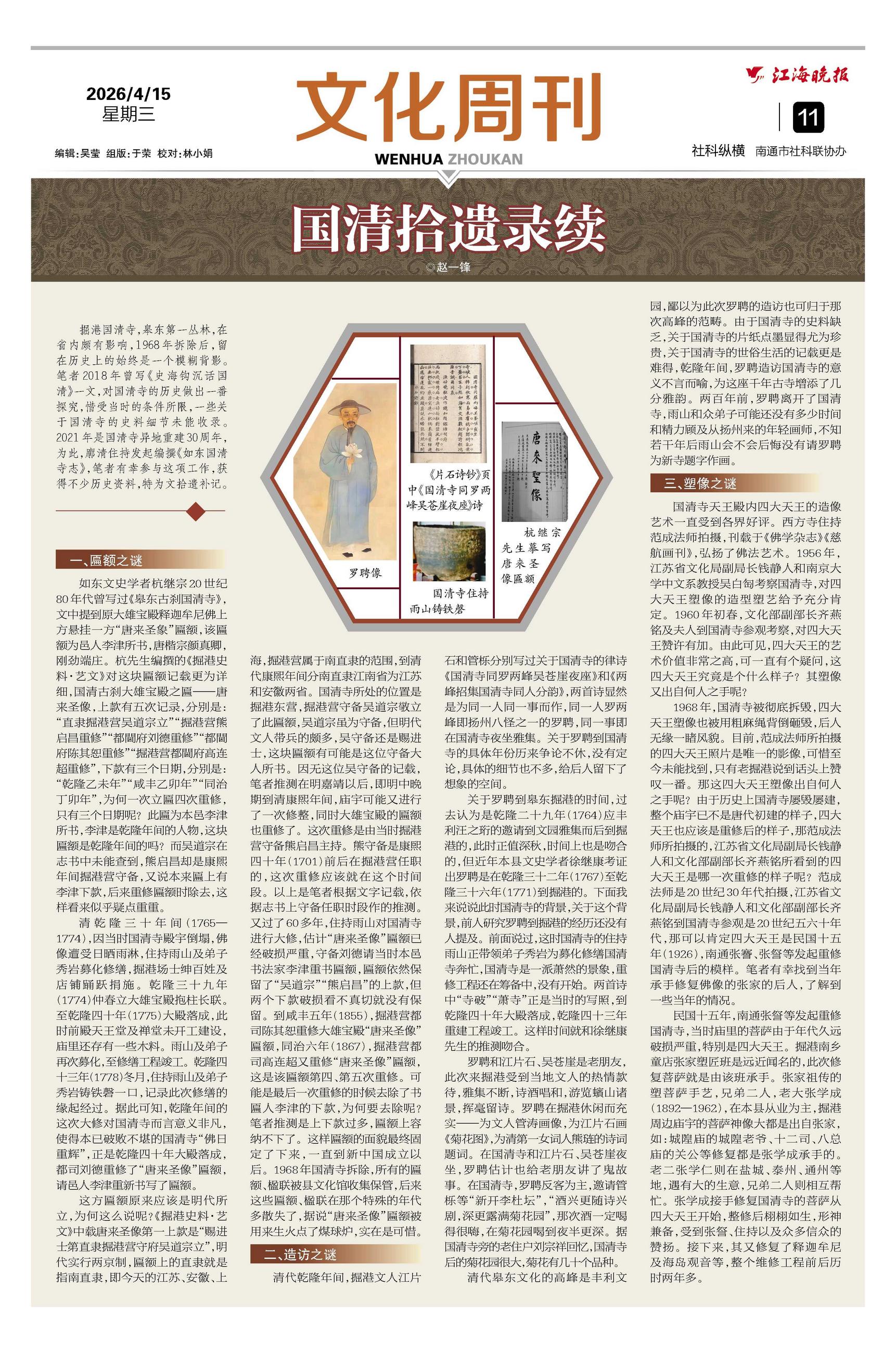 关于罗聘到皋东掘港的时间,过去认为是乾隆二十九年(1764)应丰利汪之珩的邀请到文园雅集而后到掘港的,此时正值深秋,时间上也是吻合的,但近年本县文史学者徐继康考证出罗聘是在乾隆三十二年(1767)至乾隆三十六年(1771)到掘港的。下面我来说说此时国清寺的背景,关于这个背景,前人研究罗聘到掘港的经历还没有人提及。前面说过,这时国清寺的住持雨山正带领弟子秀岩为募化修缮国清寺奔忙,国清寺是一派萧然的景象,重修工程还在筹备中,没有开始。两首诗中“寺破”“萧寺”正是当时的写照,到乾隆四十年大殿落成,乾隆四十三年重建工程竣工。这样时间就和徐继康先生的推测吻合。