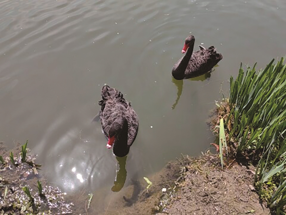 黑天鹅浮在水面上,一动不动。我以为它们在打盹。走近些,发现左边那只忽然向前滑了一小段,悄无声息的,像被风吹动的纸船。右边的也跟着移了移,仍旧并排着。
