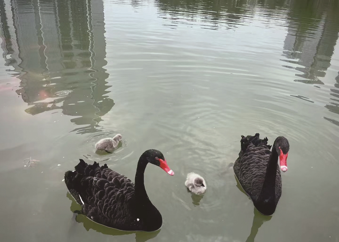 出壳第四天,雏鸟第一次下水,此时,我注意到,黑天鹅父母在孩子们的近旁担任警戒,好像在浩瀚的水面上用它们的身体隔出了一道爱的护城河,两只雏鸟就在这护城河中畅游。有了父母的护持,它们小小年纪对这片水域的深邃与广阔再也没了畏惧之心。