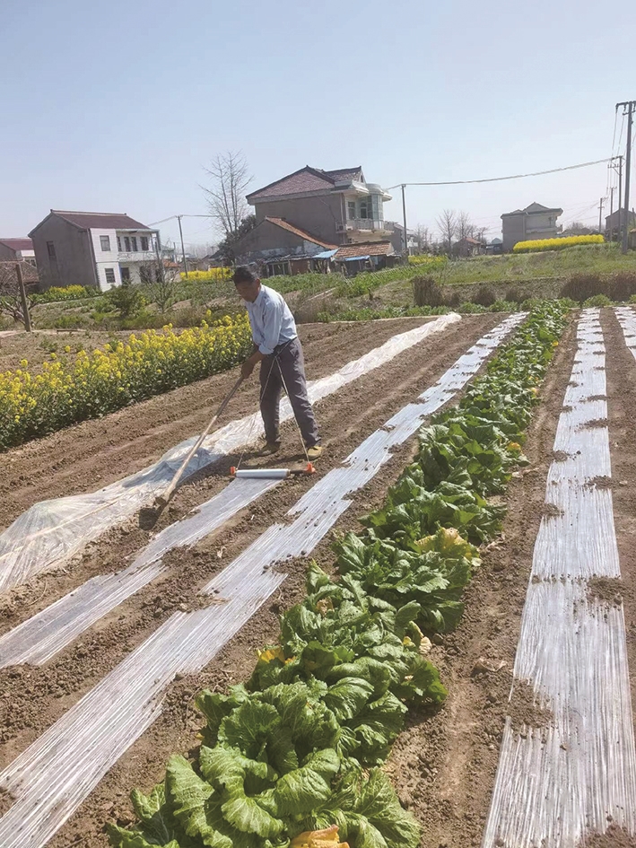 娘舅只穿一件单衣,在种玉米。腰里系一根绳,拖了一卷农用地膜倒退着走。手里一把大锄头,壅一点土到地膜上。娘舅介绍,前两天是开埭、浇水、播种、施肥、壅土、喷药,今天是铺膜、再壅土。