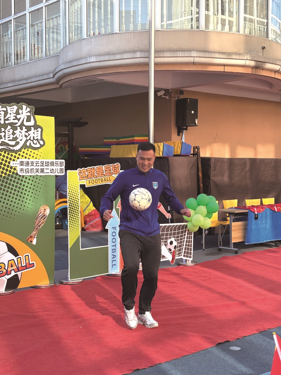 昨天,南通支云足球俱乐部青训教练陈正在展示颠球技巧。当天,市级机关第二幼儿园莘园路总园的操场上热闹非凡,南通支云足球俱乐部球员走进校园,与大班幼儿共赴一场“足球之约”。