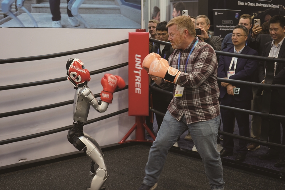 昨日,在美国拉斯维加斯消费电子展上,参观者与宇树机器人互动。2026年美国拉斯维加斯消费电子展(CES)6日至9日举行。在这一全球科技风向标式的年度展会上,“中国智造”正以更高创新密度和清晰技术路径,迈向国际竞争前沿。新华社发
