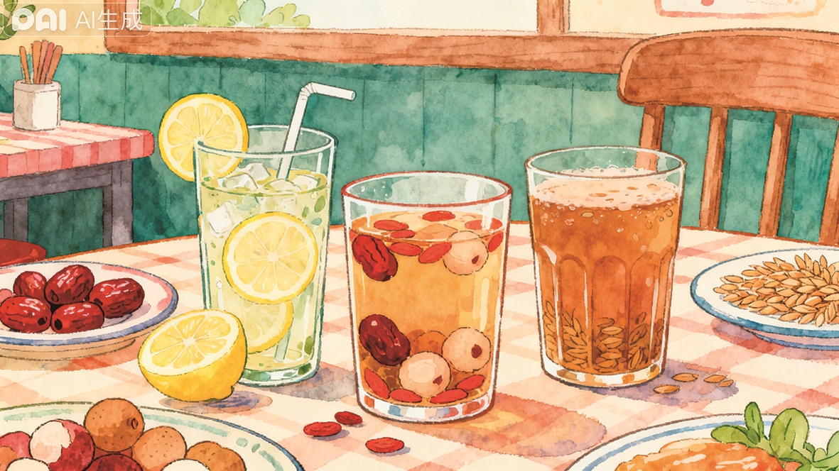 相较于夏季的清爽果蔬水,秋冬季节餐馆提供的免费水饮就略显单调,它们大多承担同一个“任务”,让顾客从寒冷的室外进来后,通过一杯暖饮迅速恢复温度,同时也唤起食欲。大麦茶、荞麦茶在秋冬季节相当流行,部分餐馆为了提升它的口感,还会额外加入新鲜或者晒干的玉米须增加甜味。还有一些店铺会提供红枣桂圆枸杞茶、八宝茶这类甜度更高的茶饮,热水冲泡后这些干果的香气被极大程度地逼出,即便不额外加糖,茶汤也是甜丝丝的,可以迅速帮助寒冷的身体补充热量。