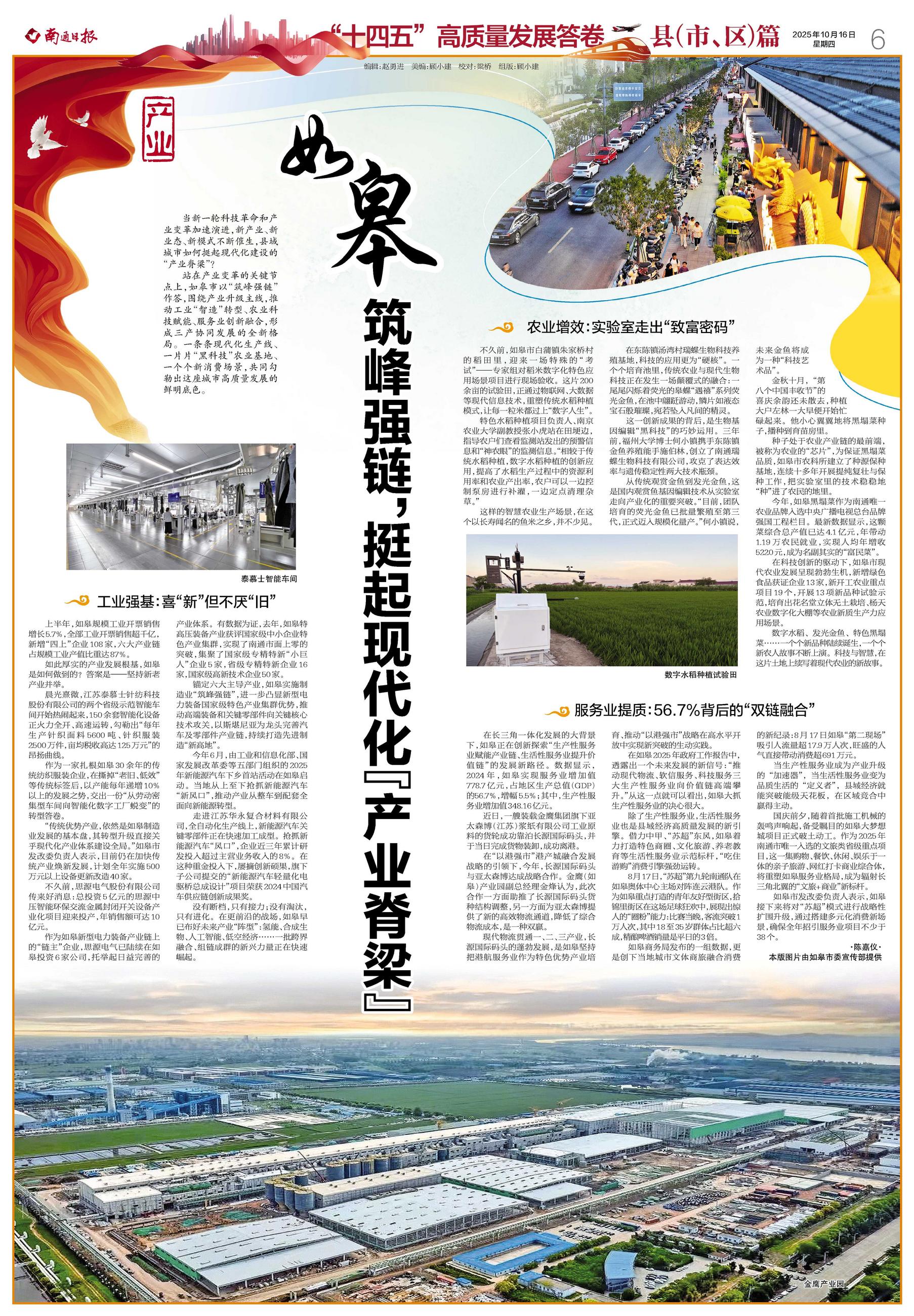 站在产业变革的关键节点上,如皋市以“筑峰强链”作答,围绕产业升级主线,推动工业“智造”转型、农业科技赋能、服务业创新融合,形成三产协同发展的全新格局。一条条现代化生产线、一片片“黑科技”农业基地、一个个新消费场景,共同勾勒出这座城市高质量发展的鲜明底色。