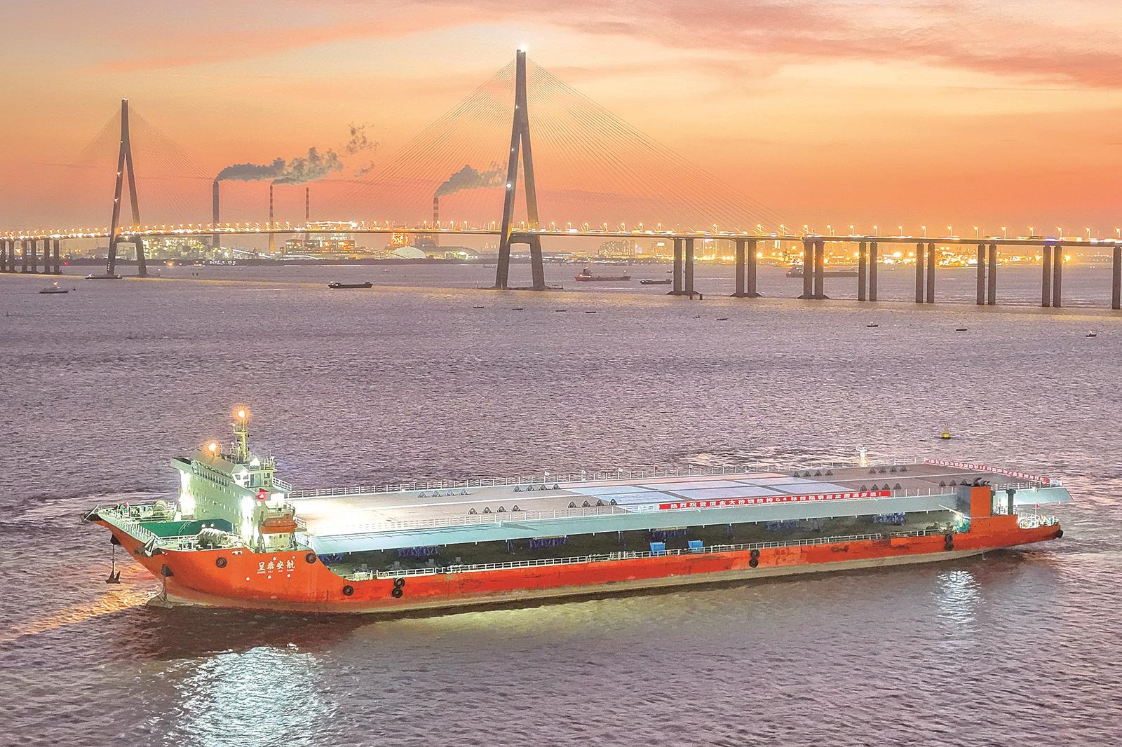 昨晚,厦金大桥G4标首个重约4586吨大节段钢箱梁在南通振华重装码头发运,标志着该项目即将进入大规模海上运输及吊装阶段。厦金大桥(厦门段)是连接厦门本岛与翔安机场的重要工程,南通振华重装承建的G4标段是主体标段之一,全长4.05公里,钢结构及附属件重超13万吨,是国内跨海通道领域 “整幅钢箱梁+以直代曲曲线拟合” 技术的标杆应用载体。 记者 许丛军摄
