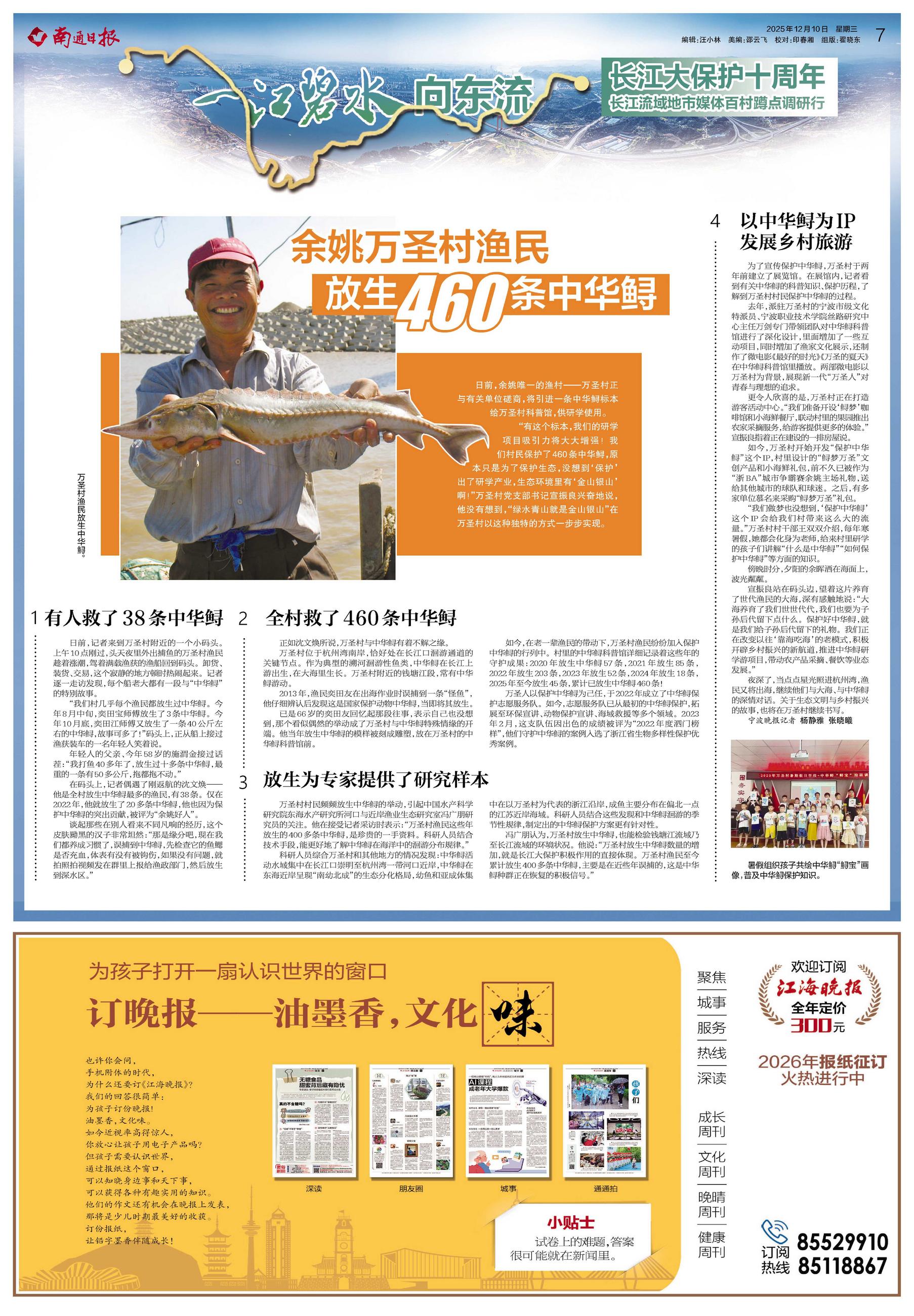 宣振良站在码头边,望着这片养育了世代渔民的大海,深有感触地说:“大海养育了我们世世代代,我们也要为子孙后代留下点什么。保护好中华鲟,就是我们给子孙后代留下的礼物。我们正在改变以往‘靠海吃海’的老模式,积极开辟乡村振兴的新航道,推进中华鲟研学游项目,带动农产品采摘、餐饮等业态发展。”
