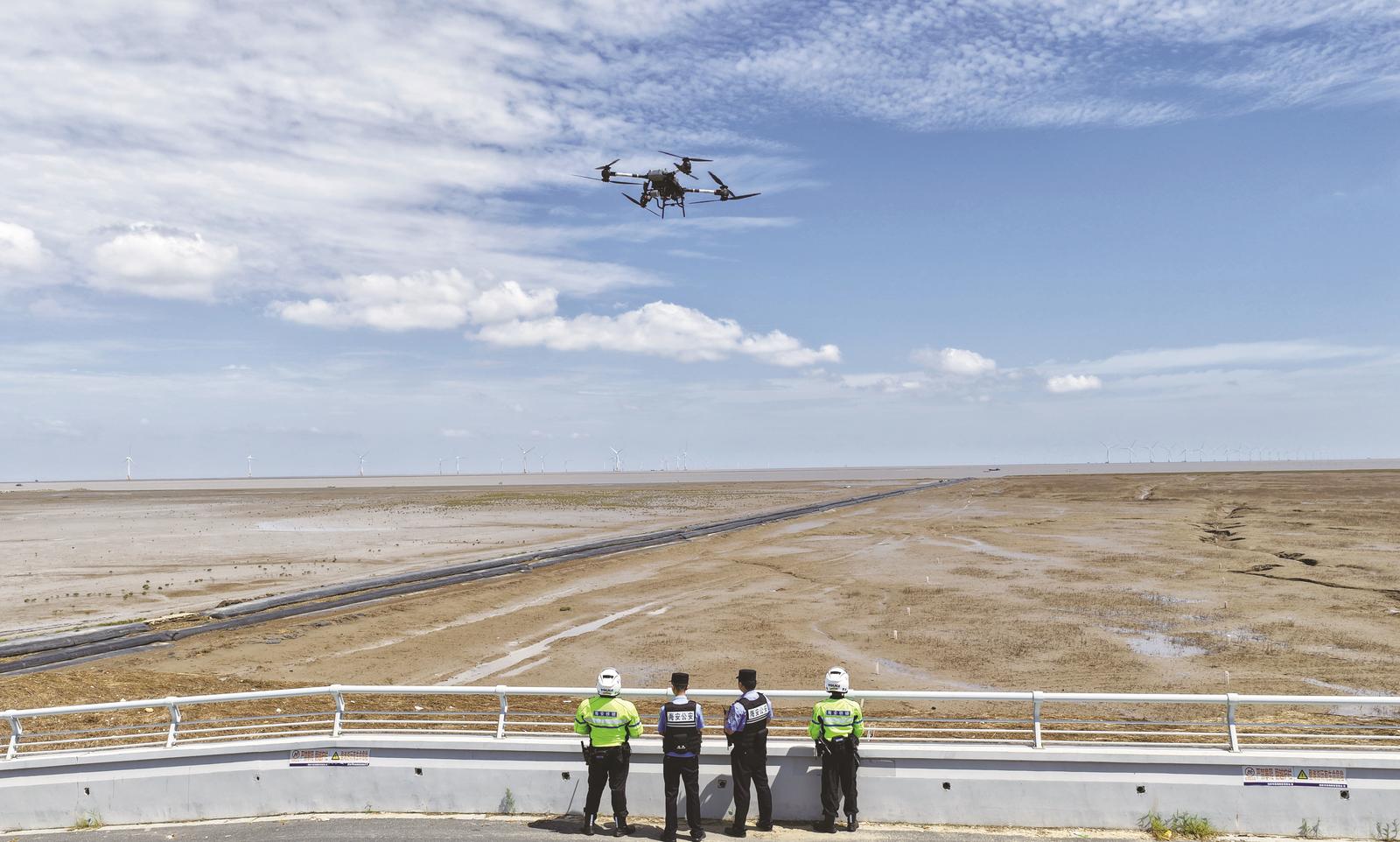 14日,民警、辅警操控无人机在沿海滩涂巡防。连日来,海安市公安局滨海新区派出所加强沿海区域巡逻防控,