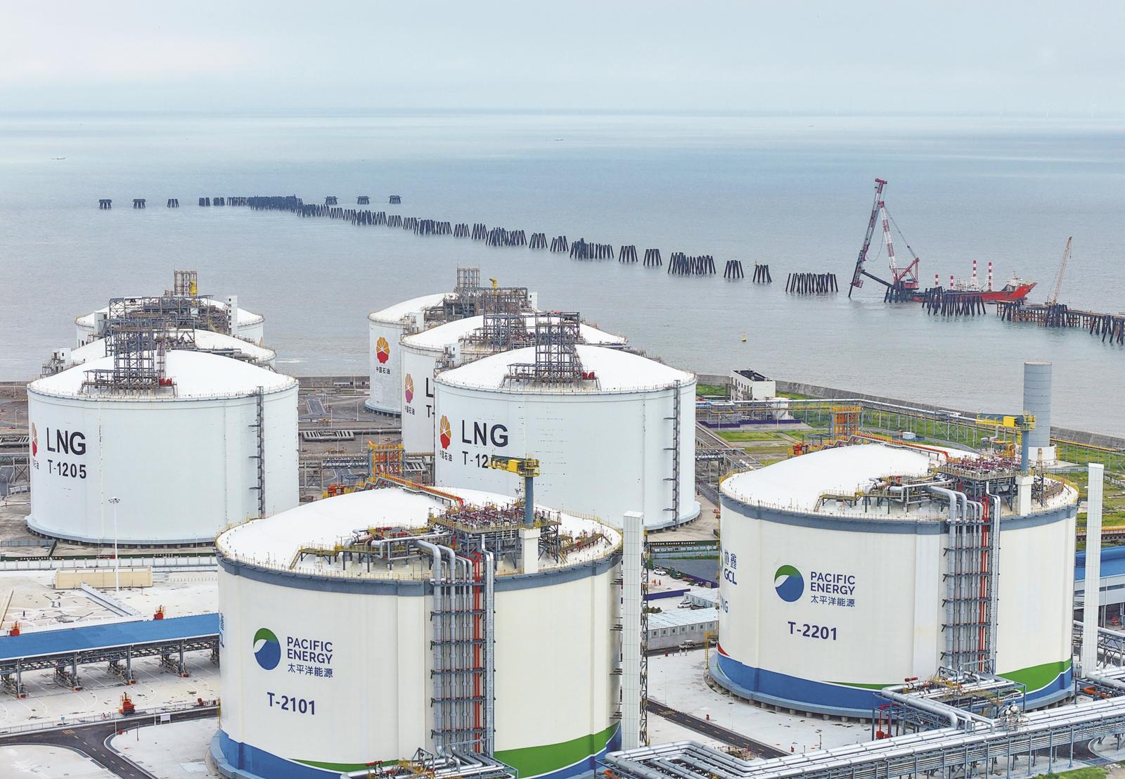 26日在如东洋口港阳光岛拍摄的LNG储罐及配套设施设备。近年来,如东强力推进LNG产业高质量发展,3平方公里的阳光岛已经成为国内最大的液化天然气(LNG)能源岛。据了解,仅中石油江苏LNG接收站投入使用以来,已累计接卸LNG超6500万吨,外输天然气近千亿立方米。待规划的4座接收站全部建成后,全岛LNG年接卸能力将达到2600万吨。 记者 许丛军摄