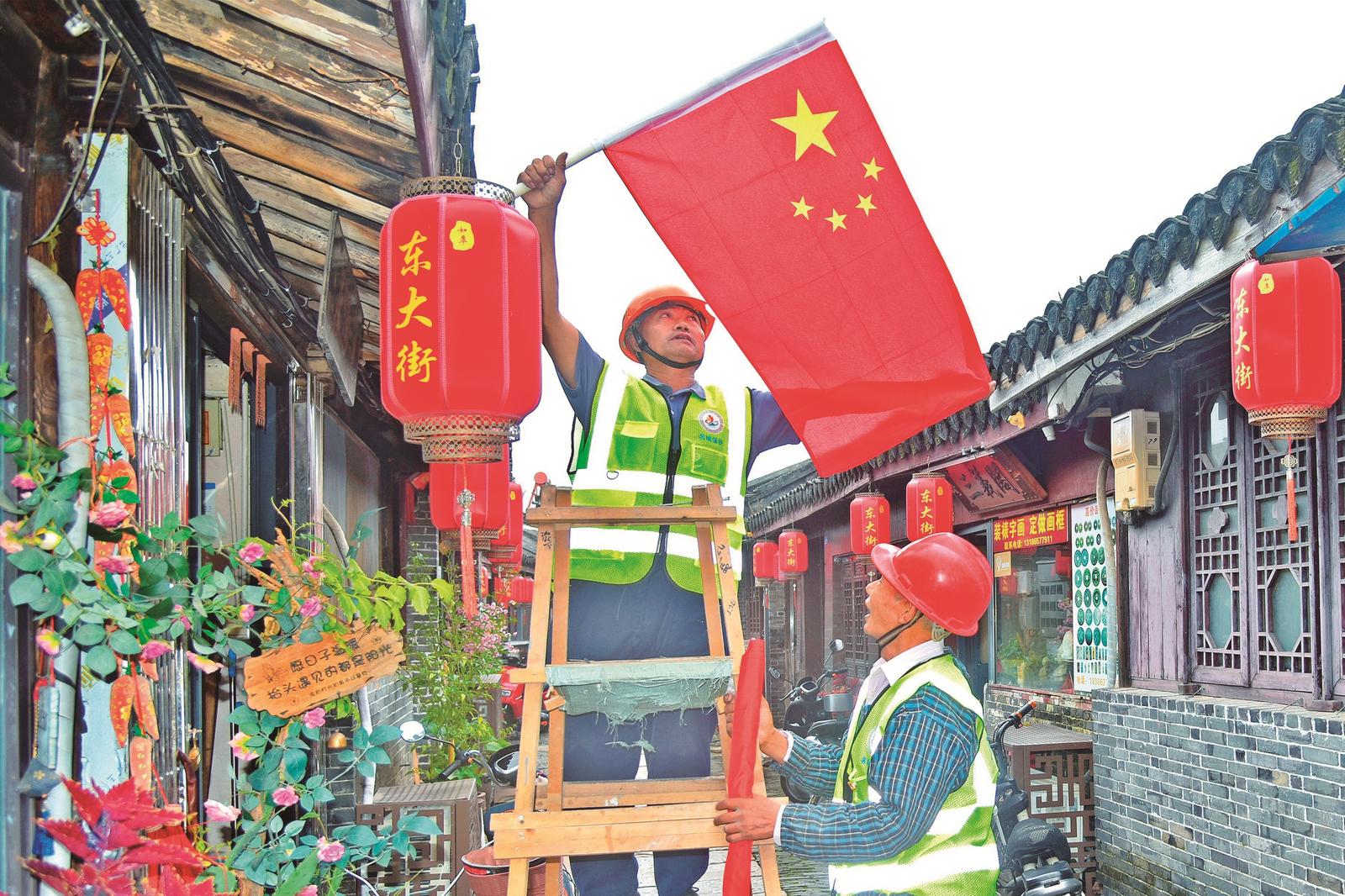 27日,如皋市东大街历史文化街区,工作人员正在悬挂国旗。 吴树建 章黎摄