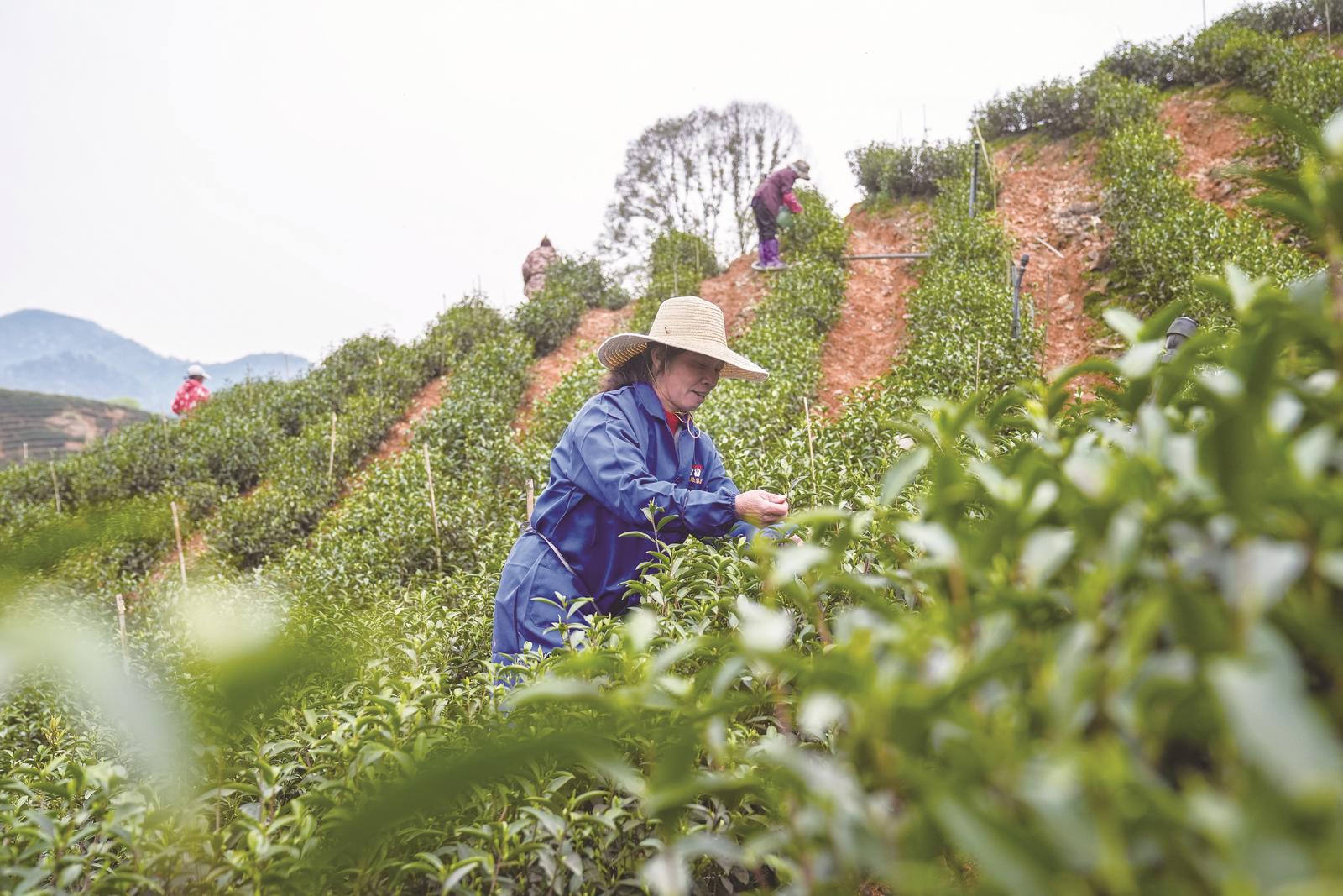 茶农采摘茶叶。