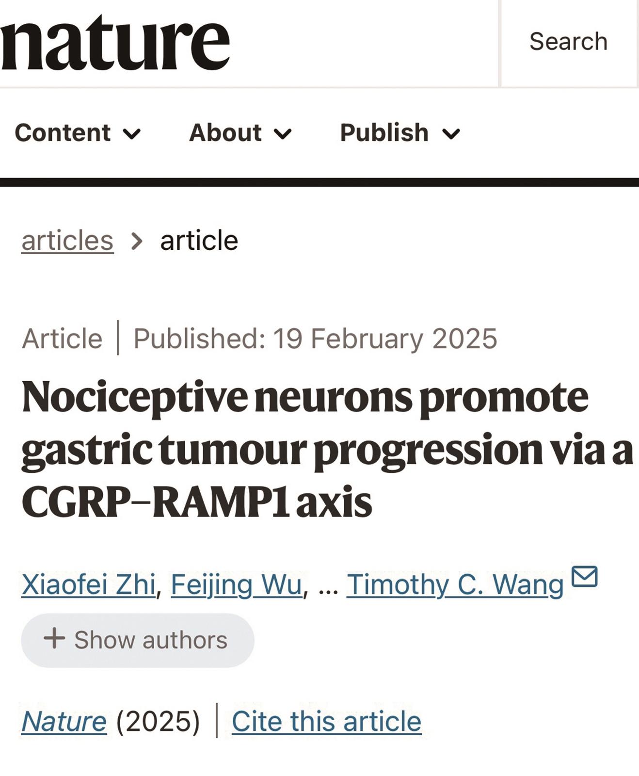 “每个临床难题都是科研的起点,研究的最终目的是将研究成果转化为切实有效的治疗疾病的手段。只有这样,科研才具有实际价值,能造福患者,有力推动医学临床实践的发展。”带着这样的目标,2025年,胃肠外科支小飞教授以唯一第一作者在世界顶级期刊《Nature》上发表研究论文,实现南通地区CNS正刊“零的突破”。同年,支小飞教授成功入选国家重大人才工程B类(万人计划)青年拔尖人才,实现了该院国家级人才自主培养的历史性突破。