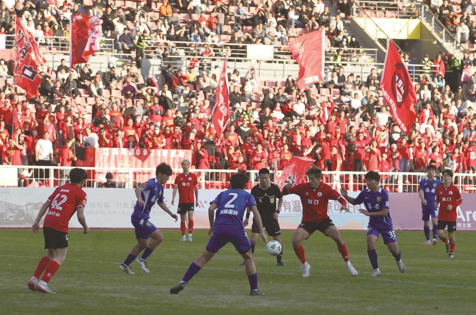 易边再战,海门队在稳固防守的基础上继续掌控比赛节奏。海安队则破釜沉舟,丰文翔、陈维酥、黄尚等小将频频利用边路速度优势制造杀机。此后双方互有攻守,但均未能改写比分。终场哨响,海门队将1∶0的胜果保持到了最后。