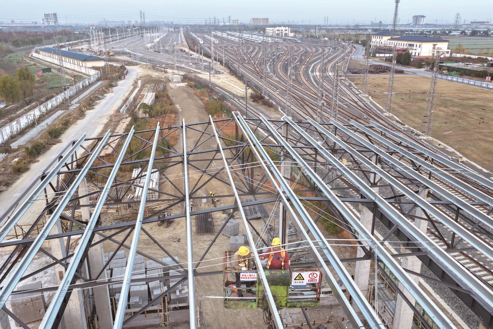 昨天凌晨,工人在南通动车所扩建工程施工现场忙碌。该工程是北沿江高铁关键配套工程之一,将新增4条检查库线、16条存车线、1条镟轮线、1条牵出线。扩建后的南通动车所将成为省内规模最大的动车检修库。 记者 许丛军摄