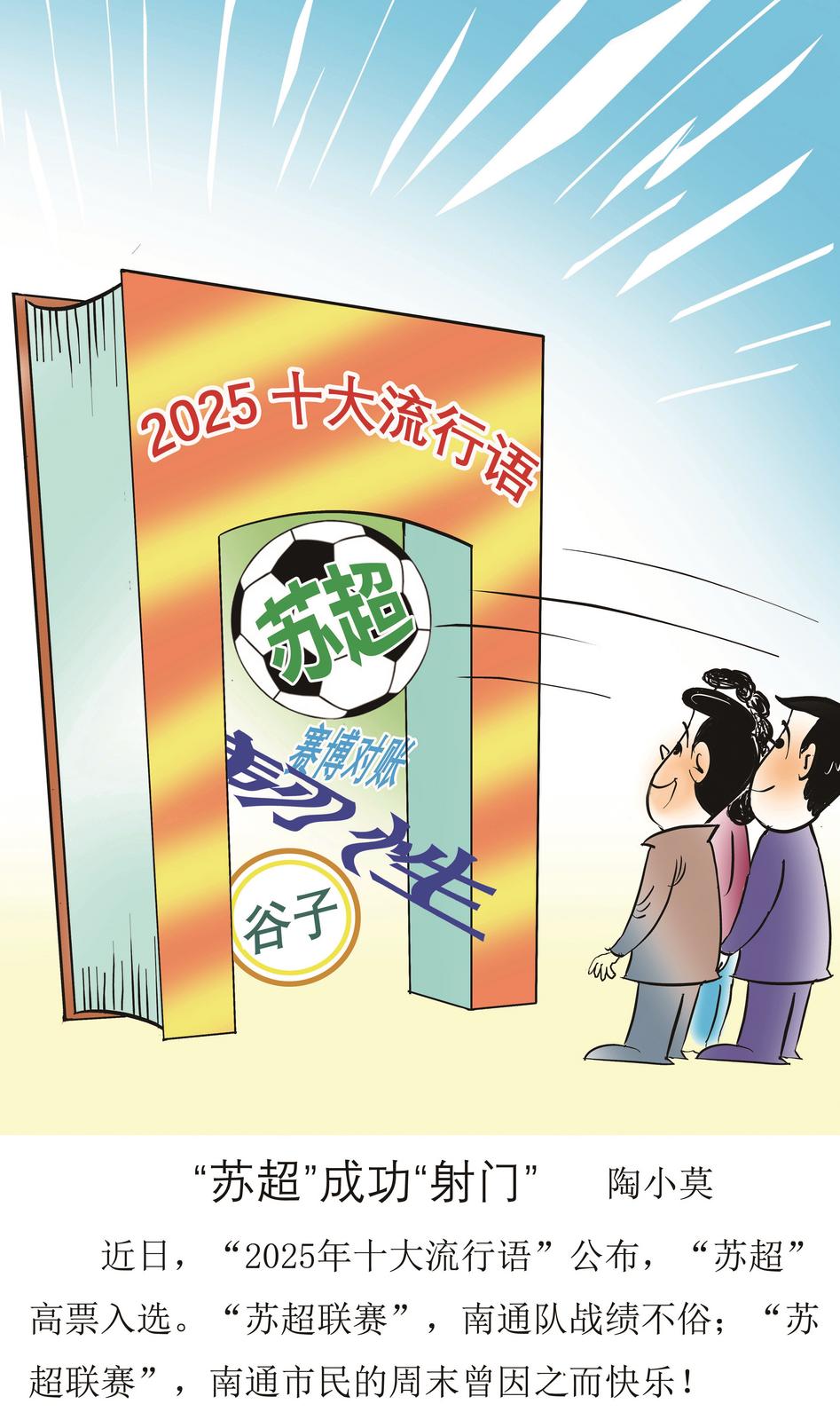 近日,《咬文嚼字》编辑部公布“2025年十大流行语”,“苏超”高票入选。“苏超”联赛,南通队战绩不俗;“苏超”联赛,南通市民的周末曾因之而快乐。