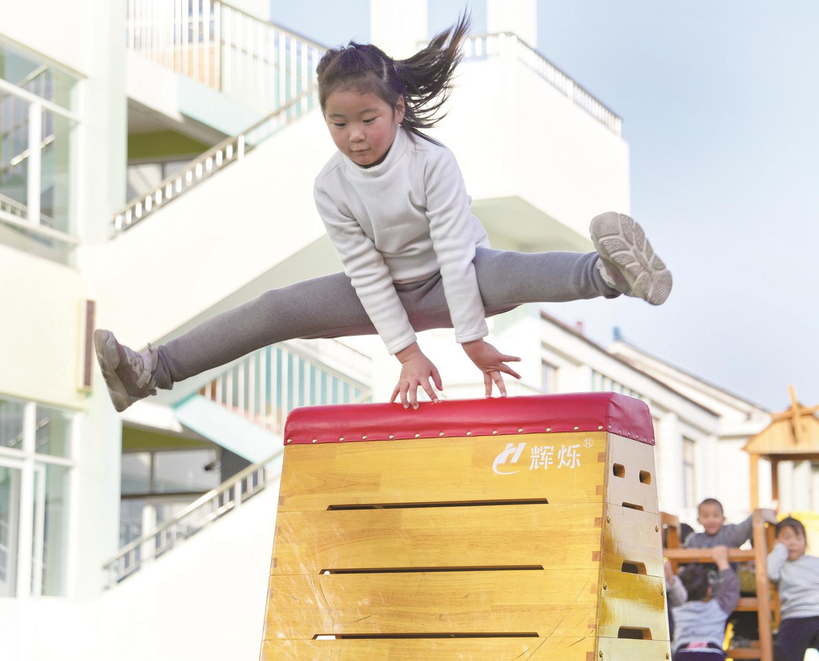10日,孩子在体能课上练习跳箱。近年来,海安市李堡镇曹园幼儿园根据幼儿的身体状况和兴趣爱好,开展多样化的体能训练项目,让幼儿在快乐运动中增强体质,促进健康成长。 周强摄