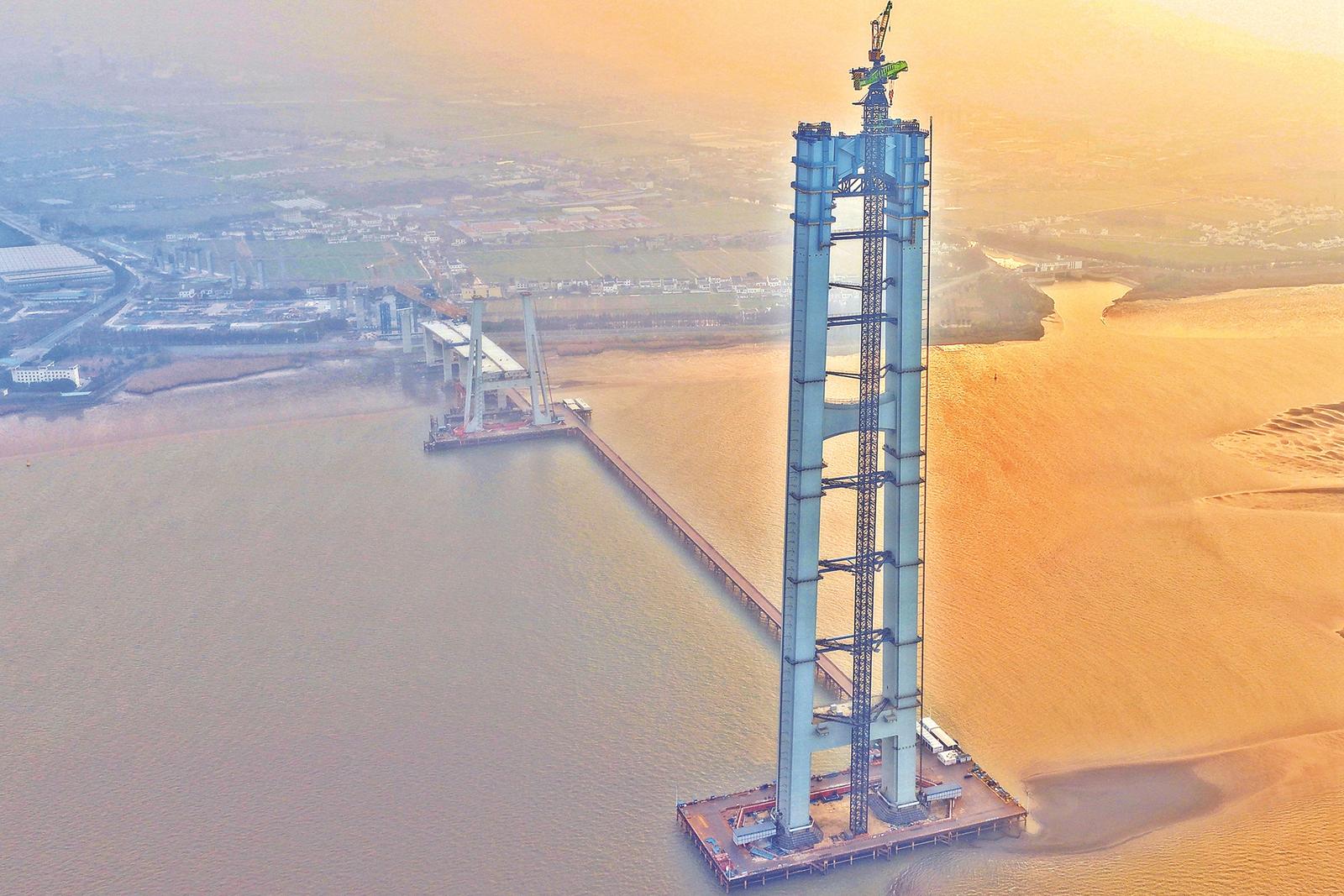 南航道桥主塔采用桥跨为2300+717米的双主塔双跨吊钢箱梁悬索桥,南、北主塔总高均为350米,为世界最高悬索桥索塔,结构为世界首创的“钢箱—钢管混凝土约束组合体系”,双侧塔肢含横梁共有128个节段(含鞍罩),单个主塔重约3.4万吨。随着施工推进,主塔高度已突破338米,相当于113层楼高。