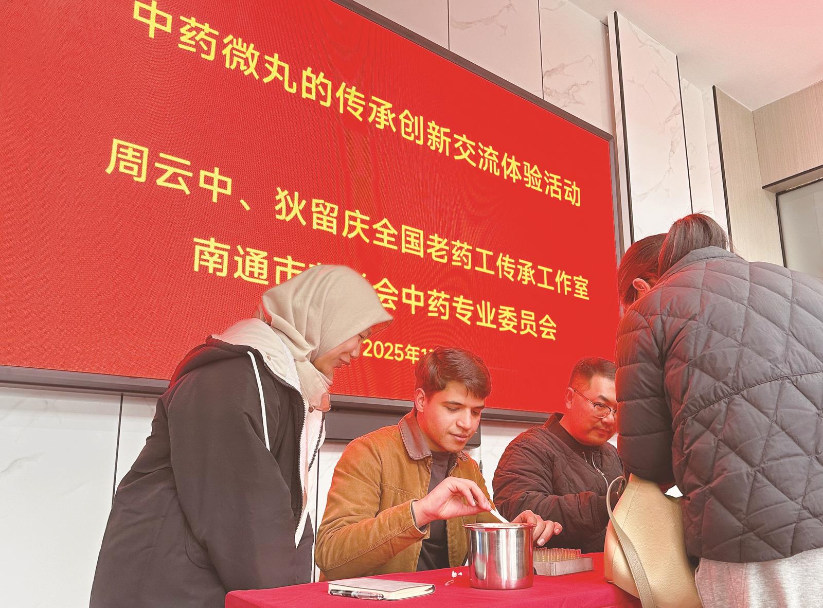 留学生在南通师傅指导下,制作世界上最轻的微丸。昨天,一批来自印度尼西亚、巴基斯坦等国的留学生来到精华制药集团老药工传承工作室,了解我国非遗名药王氏保赤丸的传承,并在南通师傅手把手教导下,学习制作药丸。