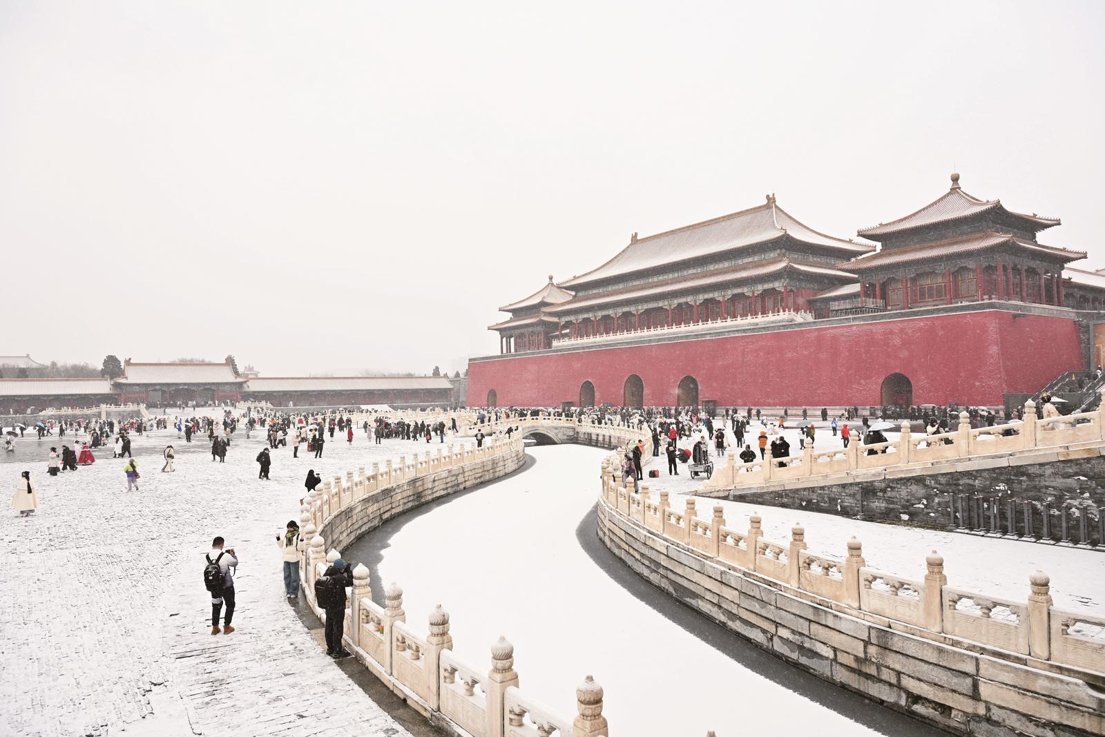 昨日,游客在北京故宫赏雪。当天,北京迎来今冬首场明显降雪。 新华社照片