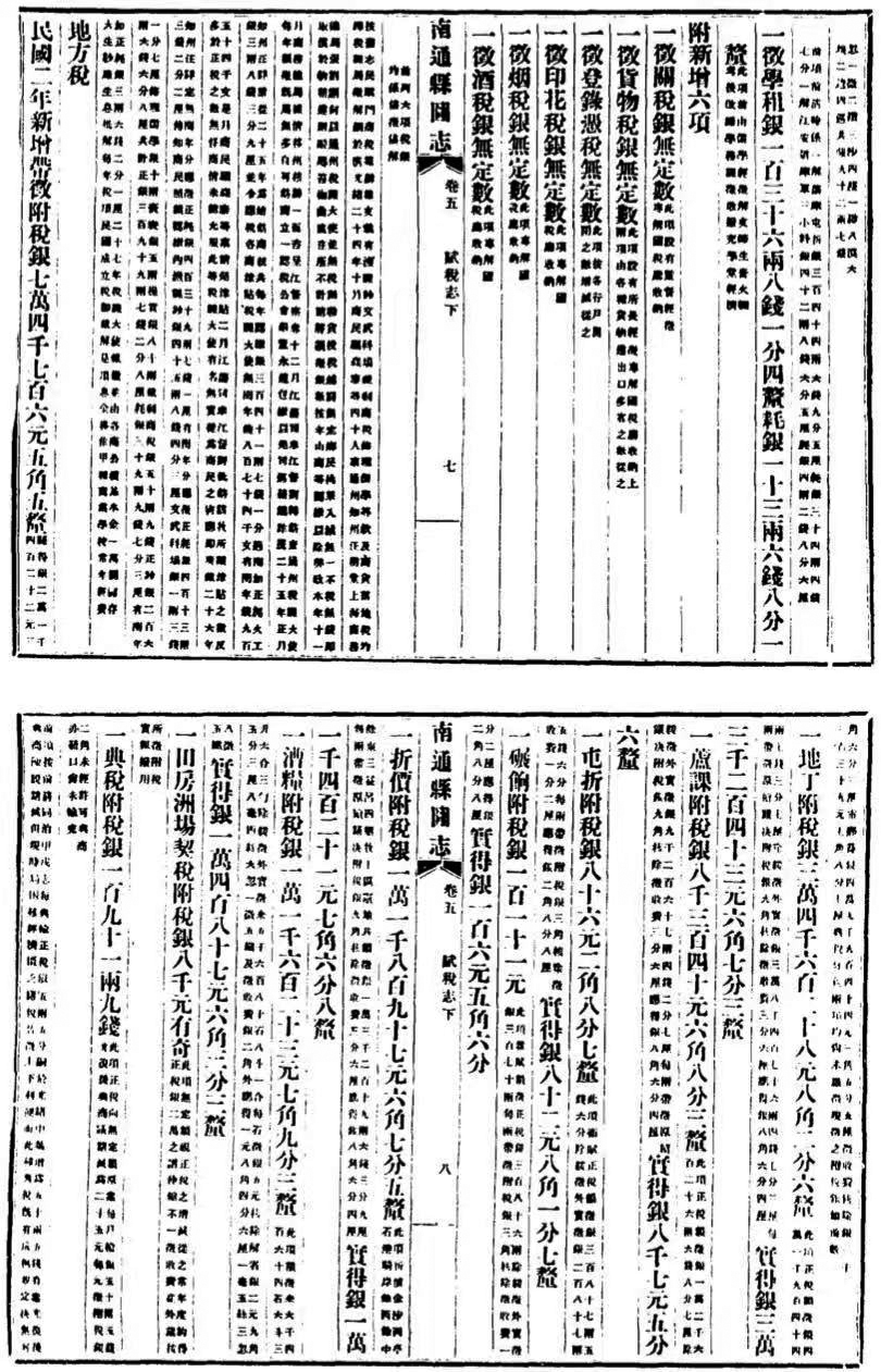民国《南通县图志》为民国初年张謇等主持编纂的地方志,记述的多为清光绪、宣统及民国初通州发生的事件。其“赋税志”部分亦主要涉及清末及民国初期。因此,翻阅民国《南通县图志》“赋税志”,即可了解清末及民国初年南通地区的税收状况。同时结合一些实物资料,可窥民国时期税制全貌。