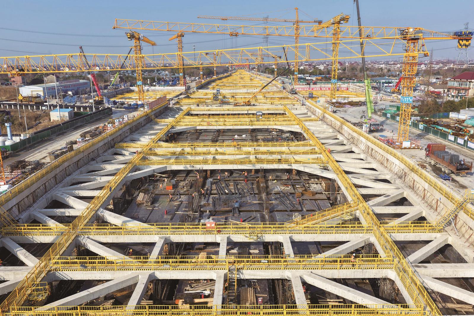 28日拍摄的由中铁一局承建的新建上海至南京至合肥高速铁路(北沿江高铁)重点控制性工程——海门北站施工现场。眼下,在我国目前最长的超深、超大基坑地下高铁站——海门北站建设现场,1800余名工人全面掀起寒冬施工大干热潮,各工点施工井然有序,力争实现新年首月“开门红”。 记者 许丛军摄