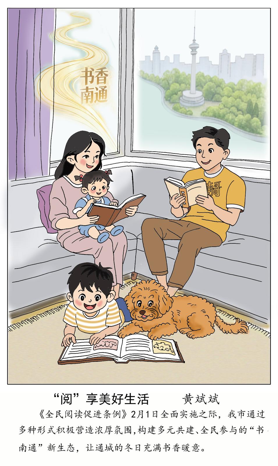 《全民阅读促进条例》2月1日全面实施之际,我市通过多种形式积极营造浓厚氛围,构建多元共建、全民参与的“书香南通”新生态,让通城的冬日充满书香暖意。 黄斌斌画