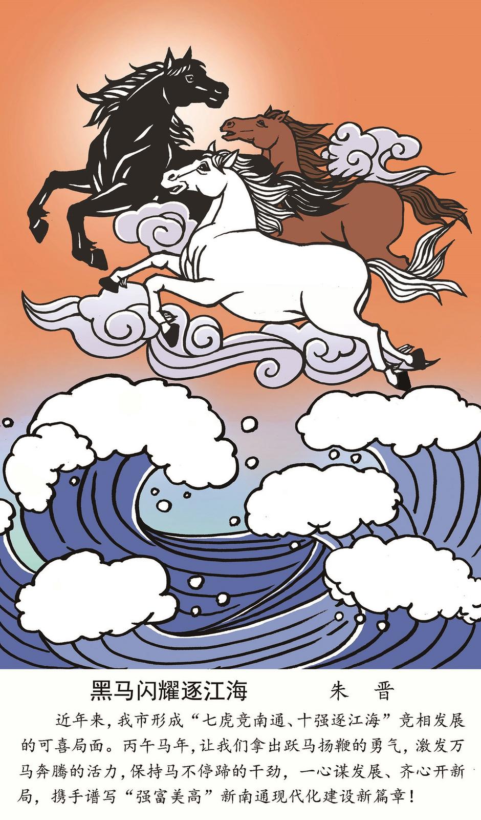 近年来,我市形成“七虎竞南通、十强逐江海”竞相发展的可喜局面。丙午马年,让我们拿出跃马扬鞭的勇气,激发万马奔腾的活力,保持马不停蹄的干劲,一心谋发展、齐心开新局! 朱晋画