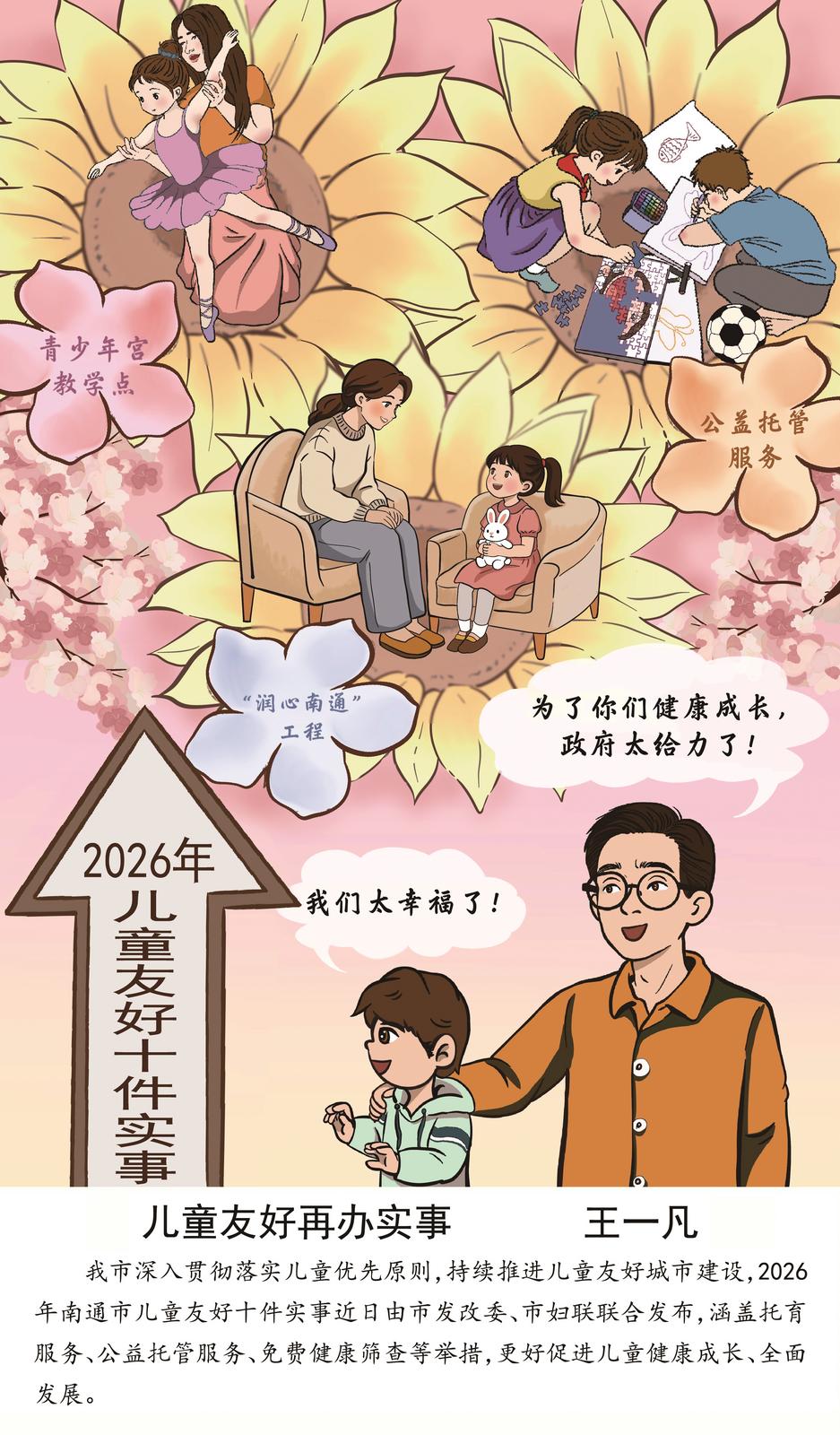 我市持续推进儿童友好城市建设,2026年南通市儿童友好十件实事近日由市发改委、市妇联联合发布,涵盖托育服务、公益托管服务、免费健康筛查等举措,更好促进儿童健康成长、全面发展。 王一凡画