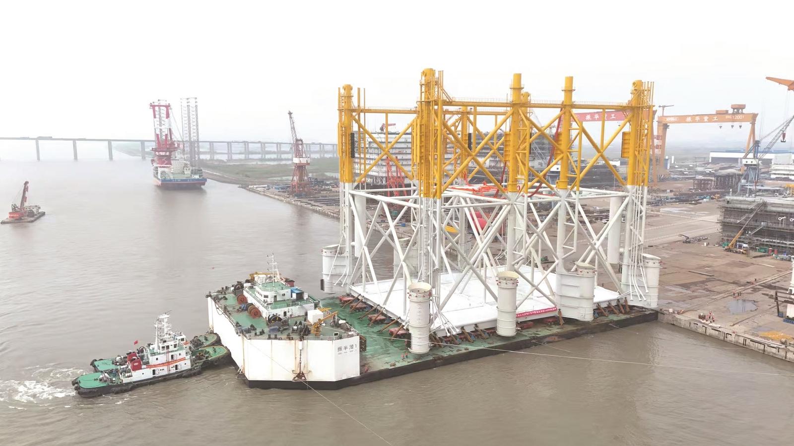 本报讯 (通讯员曹珊 郗林 记者吴霄云)10日,在南通海事局海巡艇及多艘大马力拖轮的协助下,装载阳江三山岛工程海上换流站导管架项目的“振半潜1”轮顺利离泊起航(下图),驶向粤港澳大湾区。本次发运的导管架是我国首个海上风电海陆一体柔性直流输电工程的核心基础构件,长97米、宽75米、高76米,总重超14000吨,是目前国内尺寸最大、重量最重的导管架产品。